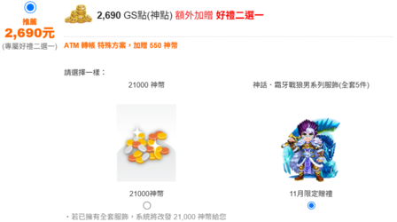 【儲值 2,690GS 點(神點)】選擇 本月限定贈禮