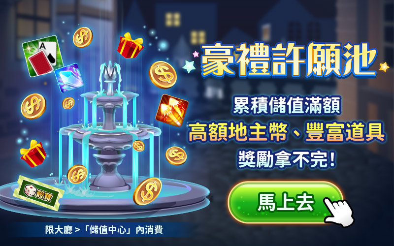 💰 儲值滿NTD 1,000 送 2,800 地主幣、21點券2張、骰寶券1張、隨機召喚卡1張